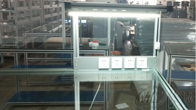 鋼化玻璃操作臺 由專用工業鋁型材作為框架,其需求根據客戶制定進行免費設計、切割加工,配件連接而組成,其中運用了鋼化玻璃作為臺面,裝有照明日光燈,以及電源插座方便實際工作中的操作,提高工作效能。